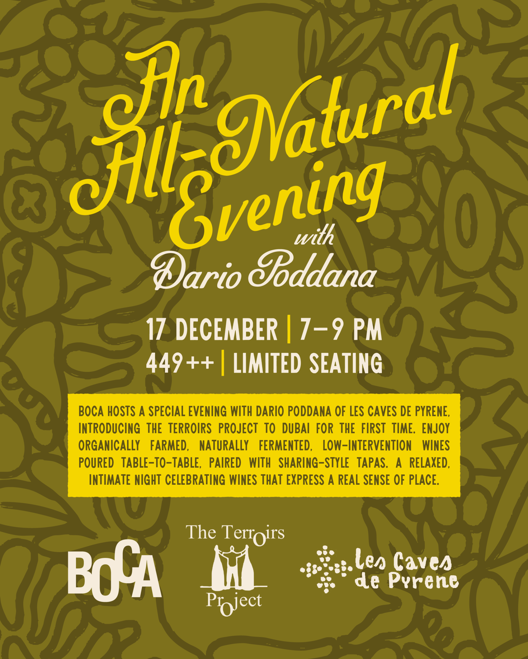For the first time in Dubai, BOCA welcomes Dario Poddana, one of the early voices who helped shape what the world now calls the natural wine movement. Together with The Terroirs Project by Les Caves de Pyrene, we present a thoughtful evening dedicated to wines made with integrity, restraint, and respect for the land.