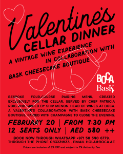 The experience concludes with a special Valentine’s collaboration with Bask Cheesecake Boutique, paired with Champagne to close the evening.
